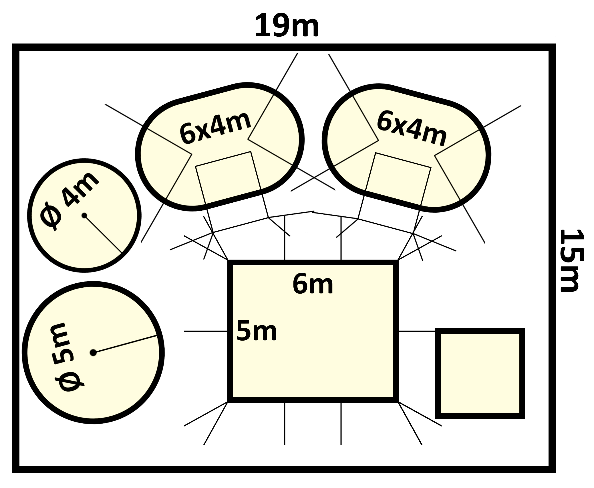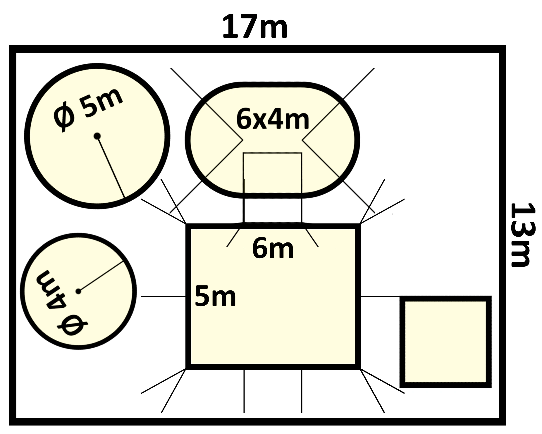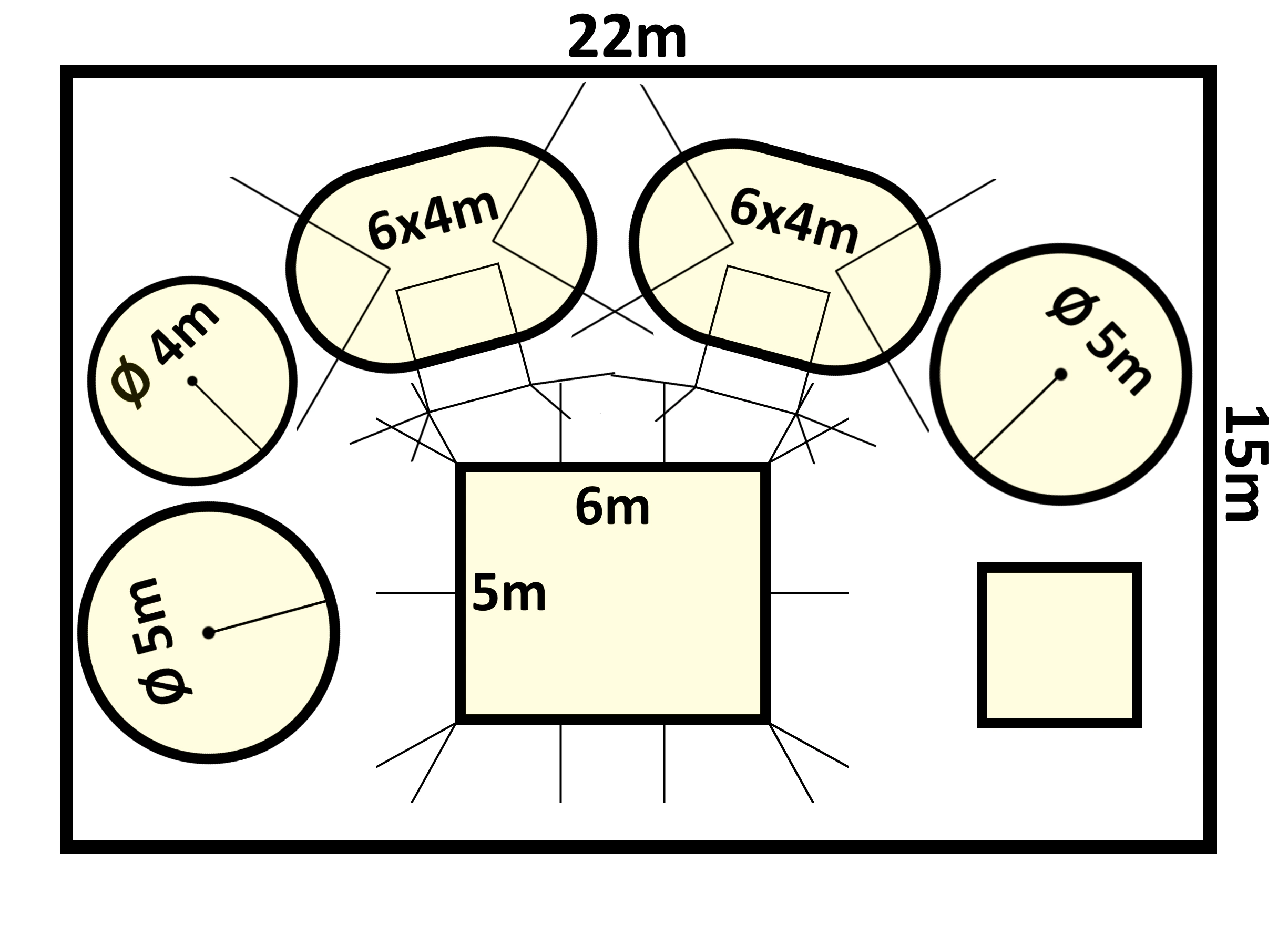 Je nach Spektakel und verfügbarem Raum variiert unser Aufbau. Hier findet Ihr unsere erprobten Lagerpläne für verschiedene Gruppengrößen.